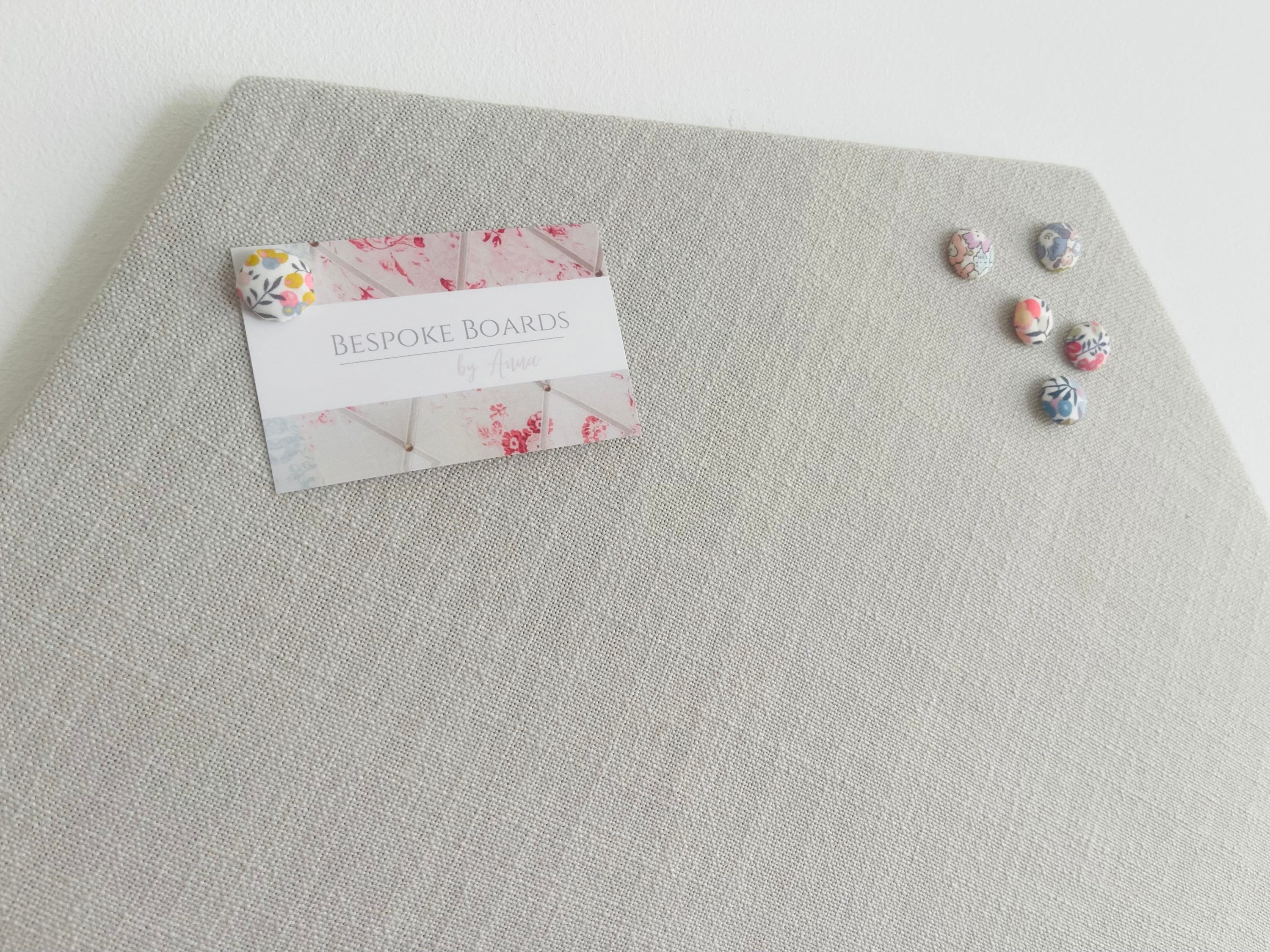 A simple hexagon fabric covered cork board covered in dove grey linen blend fabric measuring approx 50 x 43 cm.