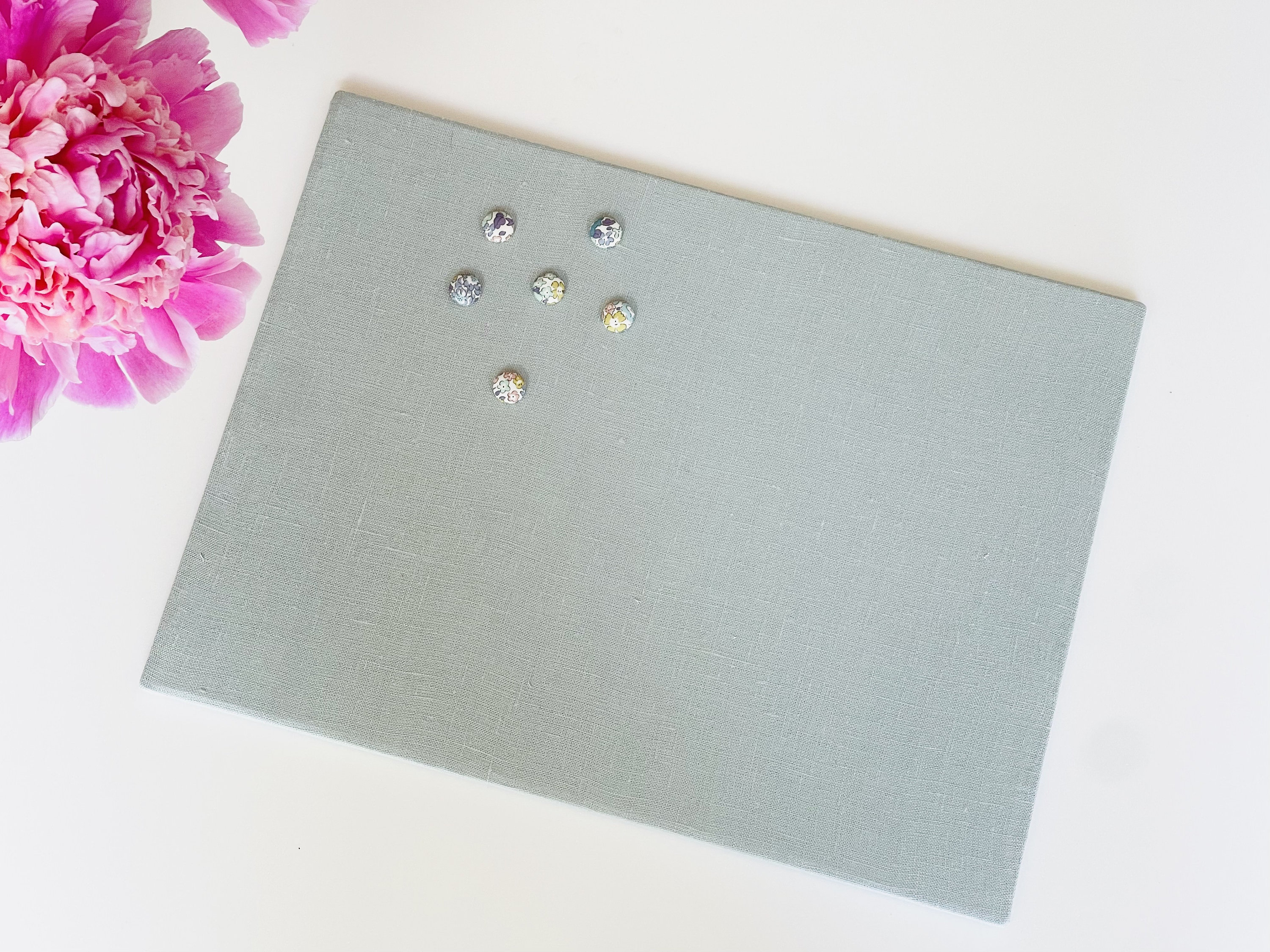 Handmade Duck egg Linen fabric magnetic board with pretty Liberty fabric magnets included.
