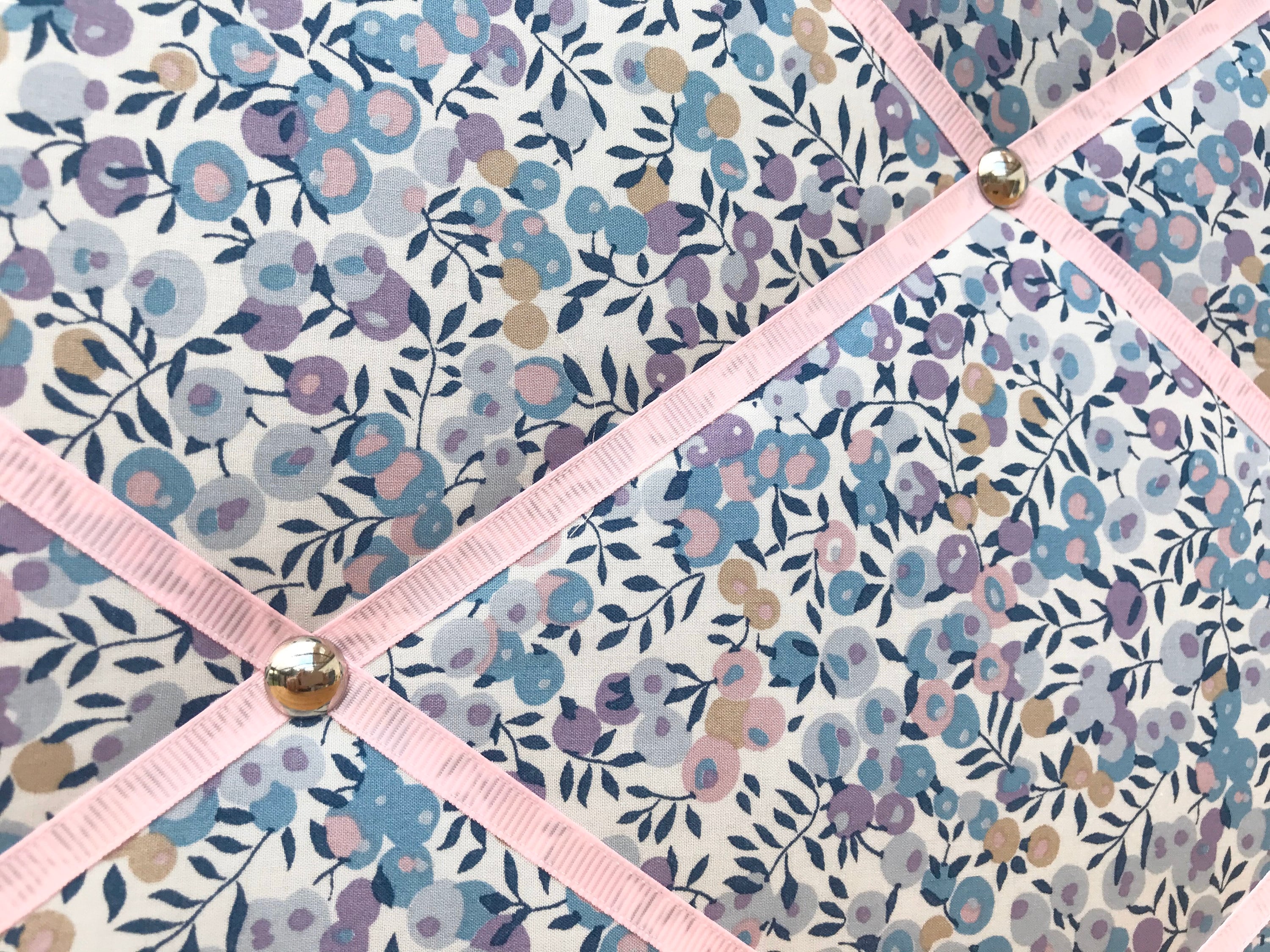 Handmade lightly padded fabric memo board, with baby pink grosgrain ribbon and Chrome upholstery nails.