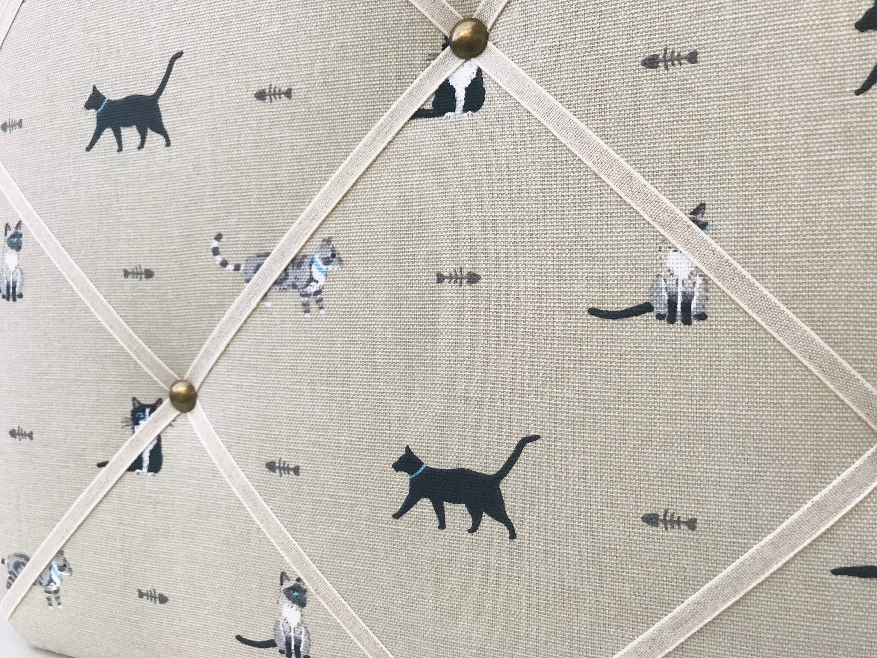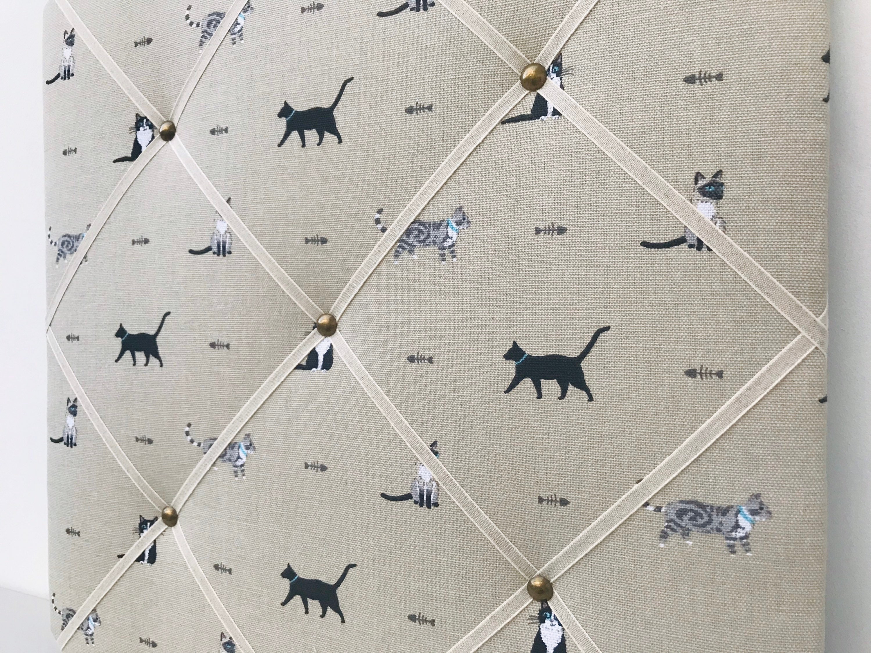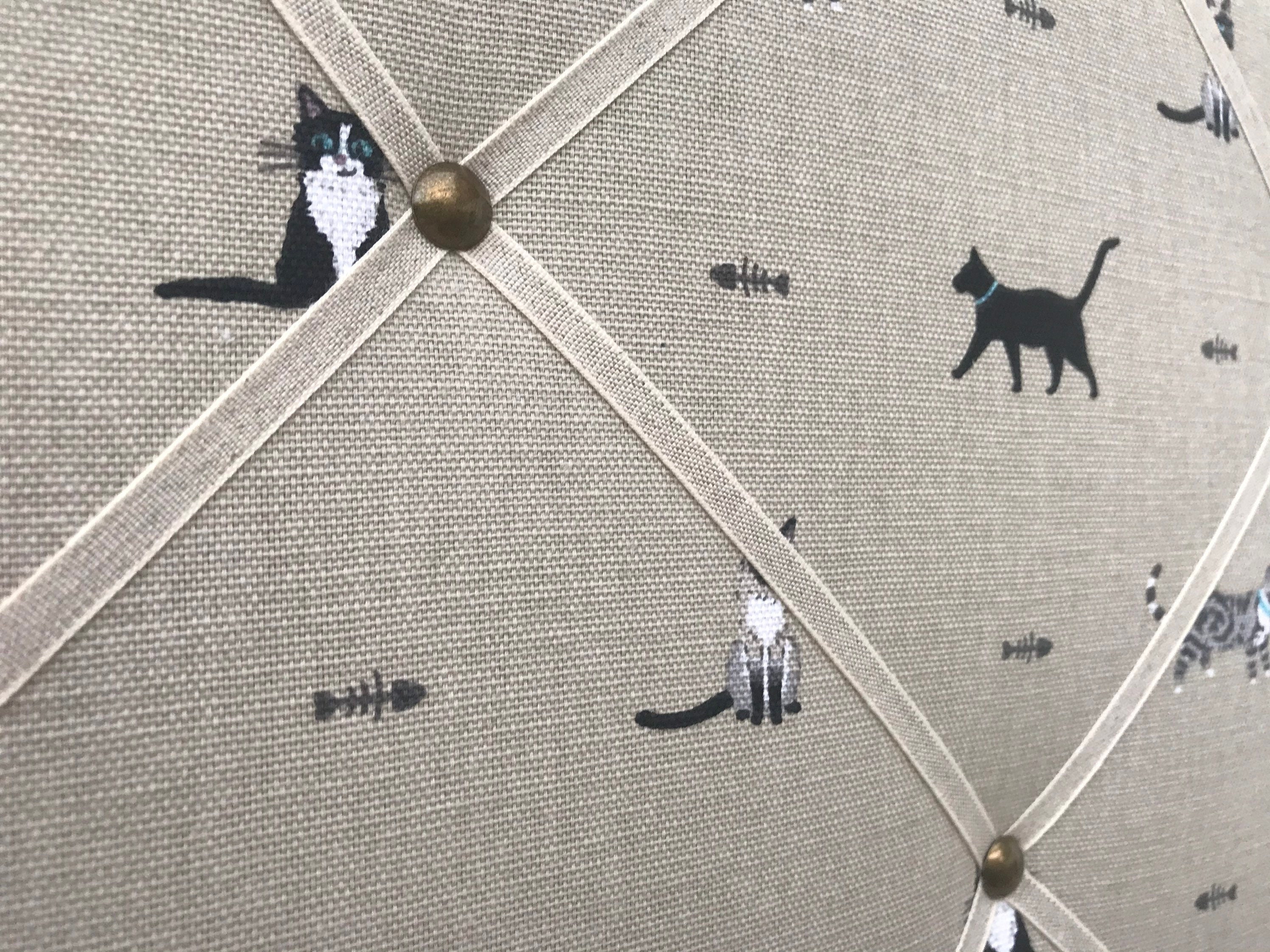 Handmade lightly padded fabric memo board, with linen ribbon and French natural upholstery nails.